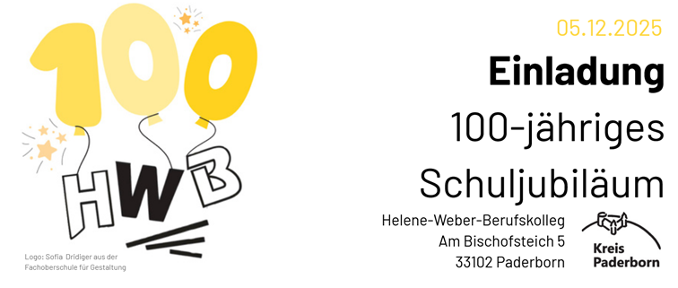 100 Jahre Schule: Stimmen aus der Vergangenheit und Visionen für die Zukunft | Teilnehmer*innen: Wilhelm Grabe, MA und Dr. Michael Hallerberg, Archivare des Kreises Paderborn und Verfasser der Festschrift; Landrat Christoph Rüther; LRSD Wolfgang Wilden und Susanne Tietje-Groß, Schulleiterin des Helene-Weber-Berufskollegs - Liedbeitrag – Happy Birthday